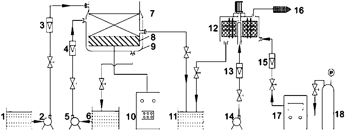 6.一種完成如權利要求5所述的一種強化鐵碳微電解-臭氧氧化法降解硝基苯廢水的方法的裝置,其特征在于:包括鐵碳微電解床(7),鐵碳微電解床(7)設有進液口和出液口,進液口通過液體流量計Ⅰ(3)以及液泵Ⅰ(2)連接硝基苯廢水儲液槽(1);鐵碳微電解床(7)底部設有超聲波振板(8),超聲波振板(8)與超聲波發生器(10)相連通;鐵碳微電解床(7)被夾套(9)所包裹,夾套(9)設有進水口與出水口,且均與儲水槽(6)相連,并通過液泵Ⅱ(5)使儲槽內的冷卻水在鐵碳微電解床(7)外循環流動控溫,冷卻水流速由液體流量計Ⅱ(4)控制;鐵碳微電解床(7)的出液口與儲液槽(11)相連;旋轉填料床(12)設有進液口、出液口、進氣口以及出氣口,其中進液口通過液體流量計Ⅲ(13)以及液泵Ⅲ(14)與儲液槽(11)連接,出液口連接至儲液槽(11);旋轉填料床(8)出氣口與尾氣吸收裝置(16)連接,進氣口通過氣體流量計(15)與臭氧發生器(17)出氣口連接;氧氣瓶(18)與臭氧發生器(17)進氣口連接。