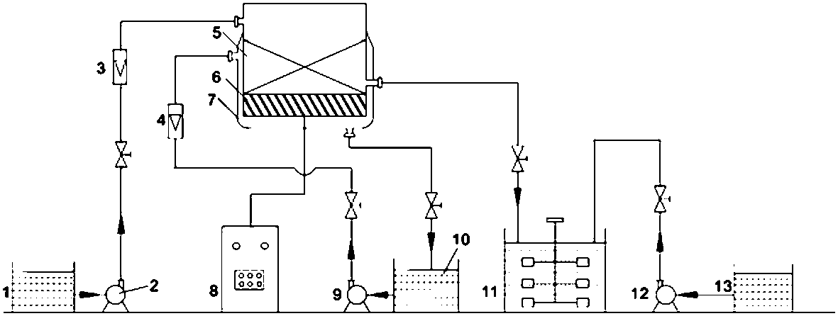 6.一種完成如權利要求5所述的超聲波/鐵碳微電解-Fenton氧化法處理硝基苯廢水的裝置,其特征在于:包括設有進液口、出液口的鐵碳微電解床(5),鐵碳微電解床(5)的進液口通過轉子流量計(3)以及液泵Ⅰ(2)連接硝基苯廢水儲液槽(1);鐵碳微電解床(5)底部裝有超聲波振板(6),超聲波振板(6)與超聲波發生器(8)相連接;微電解床(5)被夾套(7)所包裹,夾套(7)帶有進水口與出水口,且均與儲水槽(10)相連,同時通過液泵Ⅱ(9)使儲水槽內的冷卻水在鐵碳微電解槽外循環流動控溫;鐵碳微電解槽(5)的出液口與攪拌反應池(11)相連,攪拌反應池(11)通過液泵Ⅲ(12)與H2O2儲液槽(13)相連。