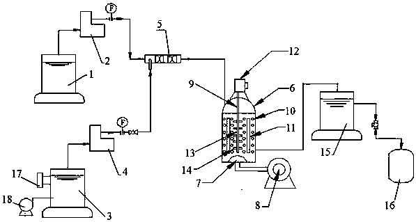 1.一種用于廢水處理的催化氧化設(shè)備,其特征在于:包括廢水池(1)、二氧化氯發(fā)生器(3)、混合器(5)、催化氧化塔(6)、沉淀池(15)和回收池(16),所述廢水池(1)和二氧化氯發(fā)生器(3)分別通過提升泵(2)和計(jì)量泵(4)連接至混合器(5)的進(jìn)水口,混合器(5)的出水口連接所述催化氧化塔(6)的進(jìn)水口,催化氧化塔(6)的出水口依次連接沉淀池(15)和回收池(16),所述催化氧化塔(6)內(nèi)設(shè)有催化劑床層(10)、攪拌裝置(9)和曝氣裝置(7),所述曝氣裝置(7)位于催化氧化塔(6)的底部,且其通過管道連接羅茨風(fēng)機(jī)(8)。