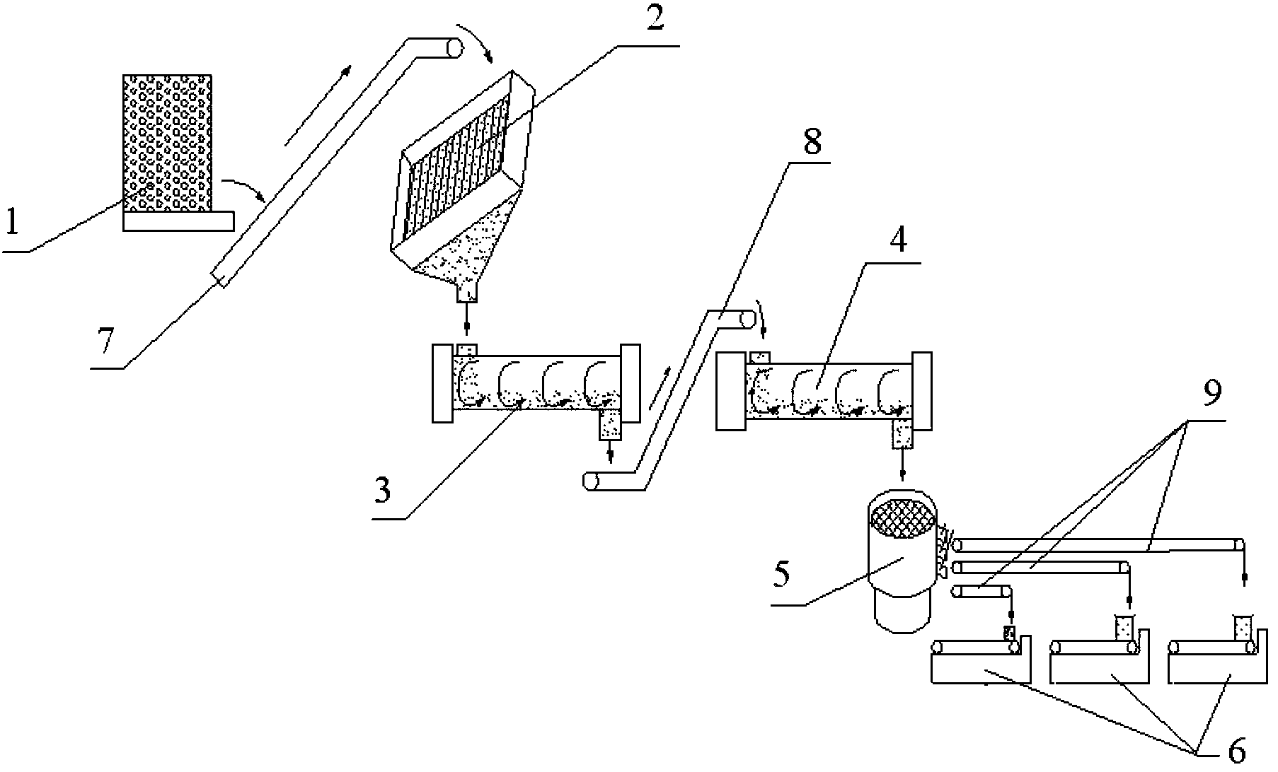 通過(guò)污泥運(yùn)輸車將污泥集中到污泥池,之后通過(guò)第一傳送帶把污泥運(yùn)送到脫水機(jī)進(jìn)行脫水,脫水后的污泥進(jìn)入到造粒機(jī)進(jìn)行處理成污泥顆粒,之后通過(guò)第二傳送帶把污泥顆粒運(yùn)送到干燥機(jī)進(jìn)行干燥處理,經(jīng)干燥處理后的干燥污泥顆粒進(jìn)入到篩分機(jī)進(jìn)行篩分,不同粒徑的干燥污泥顆粒經(jīng)不同的出口輸出,并通過(guò)第三傳送帶運(yùn)輸?shù)酱b機(jī)進(jìn)行裝袋,形成袋裝污泥,進(jìn)行二次利用。