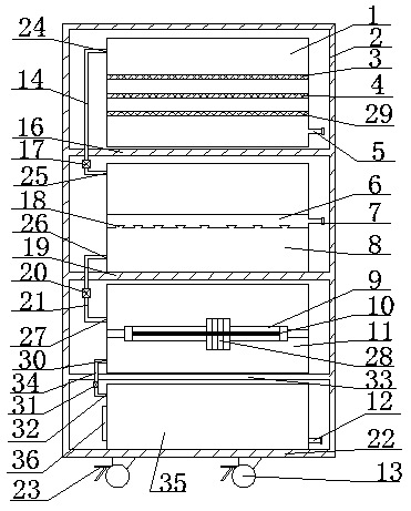1.一種廢水凈化回收裝置,其特征是:包括殼體,所述殼體內自上而下依次設置有第一隔板、第二隔板和第三隔板,所述第一隔板上設置有過濾箱,所述第二隔板上設置有除臭箱,所述第三隔板上設置有消毒箱,所述殼體的底板上設置有凈水收集箱;