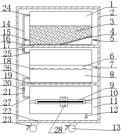 本方案是通過如下技術措施來實現的:一種廢水凈化消毒裝置,包括殼體,所述殼體內設置有第一隔板和第二隔板,所述第一隔板位于所述第二隔板的上部,所述第一隔板上設置有過濾箱,所述第二隔板上設置有除臭箱,所述殼體的底板上設置有消毒箱;