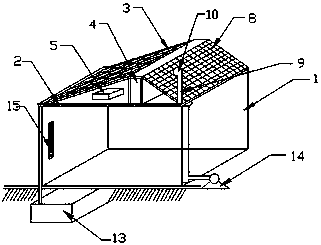 2.根據權利要求1所述的一種帶有雨水處理裝置的綠色建筑,其特征在于,所述溫度傳感器(15)電性連接所述控制器(6),所述控制器(6)電性連接所述水泵(14),所述太陽能光伏電板(3)電性連接所述蓄電池(7)。