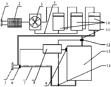 1.一種改進的雨水處理回用裝置,包括格柵除污裝置,該格柵除污裝置一端設有進水口,另一端連接有攪拌裝置,所述攪拌裝置與平板膜微濾裝置連接,該平板膜微濾裝置末端設有出水口,所述平板膜微濾裝置與所述攪拌裝置之間設有回流管道,其特征在于,所述平板膜微濾裝置通過儲水箱進水管連接有儲水箱,該儲水箱通過回用水管連接出水口;所述儲水箱進水管上設有第一閥門;所述回用水管上設有第二閥門。