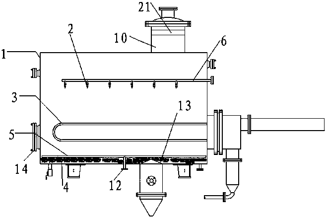 1.一種除垢分離組件,其特征在于:包括分離器密閉罐體和設置在分離器密閉罐體內的料液噴嘴和與料液噴嘴配合使用的加熱管,所述料液噴嘴設置在上部,所述加熱管設置在下部且用于承接料液噴嘴噴出的料液;所述分離器密閉罐體底部設置有惰性固體顆粒和用于產生氣流將惰性固體顆粒吹動至流化態沸騰的壓縮空氣管。
