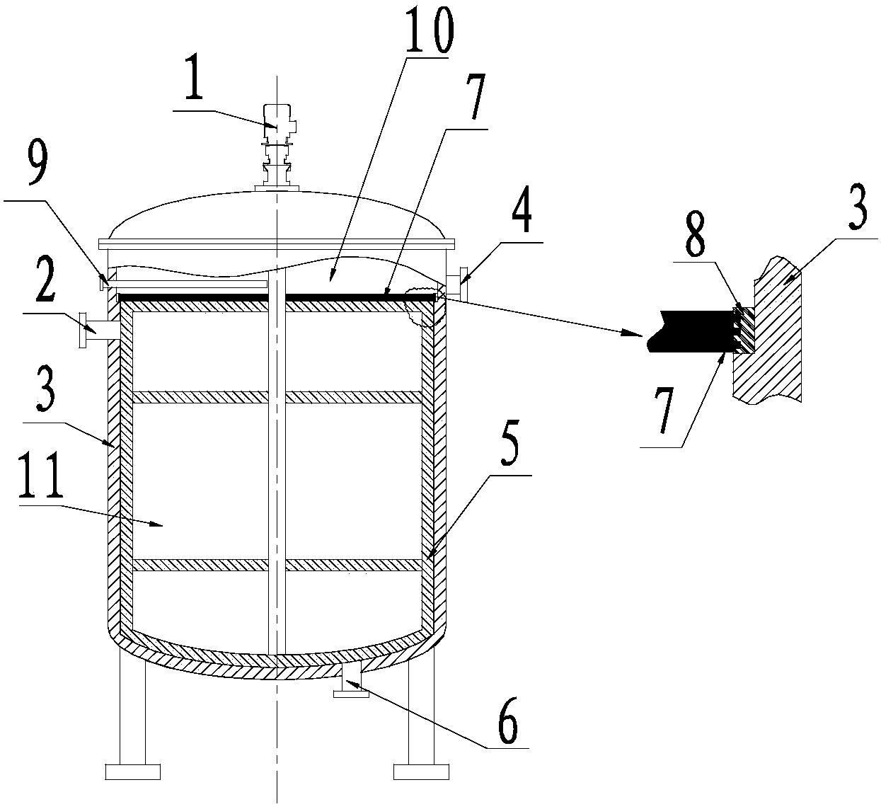 2、本實(shí)用新型采用攪拌葉片和罐體緊貼的設(shè)計(jì),可以在混合絮凝過程中,同時(shí)將粘附于罐體內(nèi)壁的污泥刮下,使之與絮凝劑發(fā)生反應(yīng),提高了污泥絮凝濃縮效率。