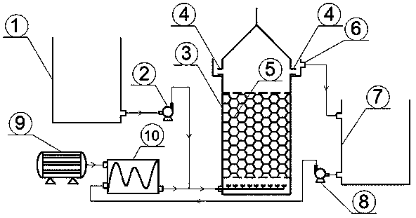 本發明所述的臭氧氧化水處理系統,其特征在于包括原水池、進水泵、臭氧氧化反應塔、接觸填料、集水槽、清水池、回流泵、臭氧發生器和預混合器,其中原水池底部出水口通過進水泵與臭氧氧化反應塔底部布水器的進水口相連接,臭氧氧化反應塔的頂部設有排氣口,臭氧氧化反應塔的內部填充有接觸填料,臭氧氧化反應塔的上部外圍設有集水槽,臭氧氧化反應塔中處理后的污水通過溢流口溢流進入集水槽,該集水槽的排水口與清水池相連通,清水池底部的回水口通過回流泵與預混合器的進液口相連接,臭氧發生器的出氣口與預混合器的進氣口相連接,預混合器的出液口與臭氧氧化反應塔底部布水器的進水口相連接。
