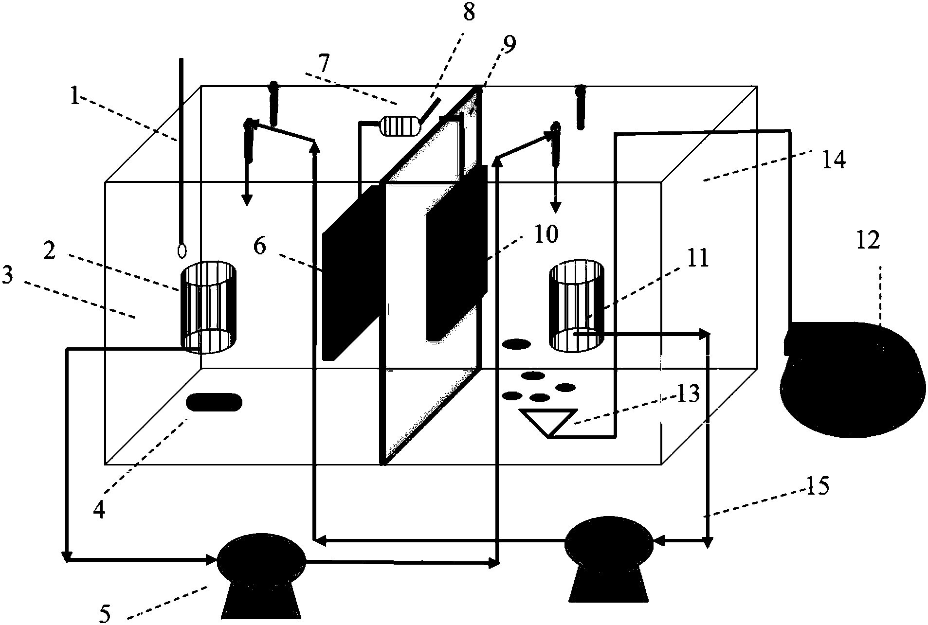 2)厭氧-陽極池和好氧-陰極池中放置由工業濾布制成的動態膜組件,通過恒流泵將厭氧-陽極池中的污水通過動態膜組件的出水口抽至好氧-陰極池中;同時,將好氧-陰極池中的污水用恒流泵將動態膜組件的出水口抽回至厭氧-陽極池,以形成厭氧-陽極池和好氧-陰極池中污水在時間和空間上同時連續循環處理,完成對污水的處理過程;