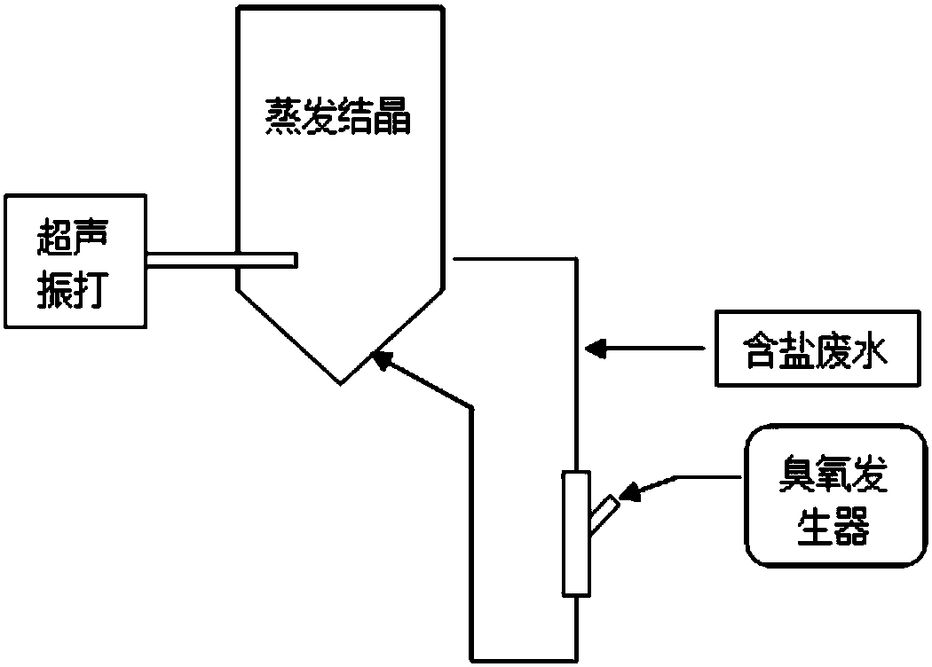 1)本發明在結晶器循環管設置氧化處理反應器,實時進行高級氧化,去除料液攜帶的有機物;同時在結晶器靠下位置設置超聲波振打裝置,在產生結晶顆粒的同時對其進行擦洗,剝離表面附著的雜質,提高結晶鹽純度;