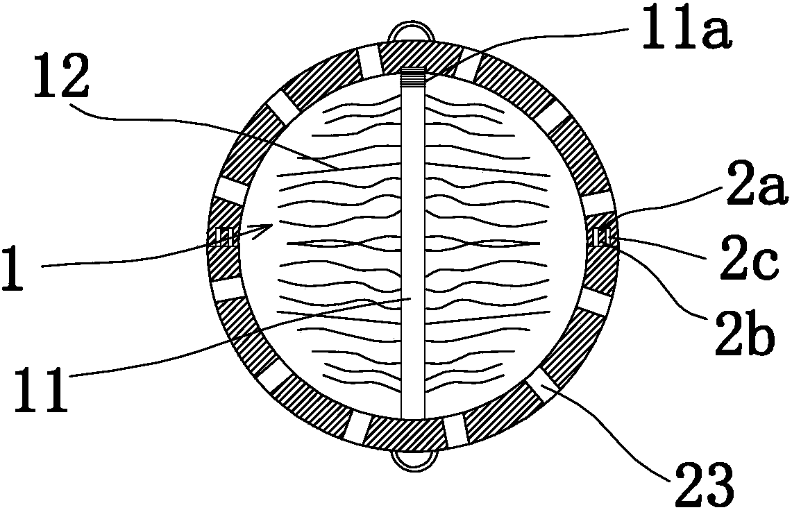 6.根據權利要求5所述的生物法污水處理池,其特征在于:所述的第一半球體(21)和第二半球體(22)的頂端處分別設有便于拉開球體(2)的拉環(2d)。