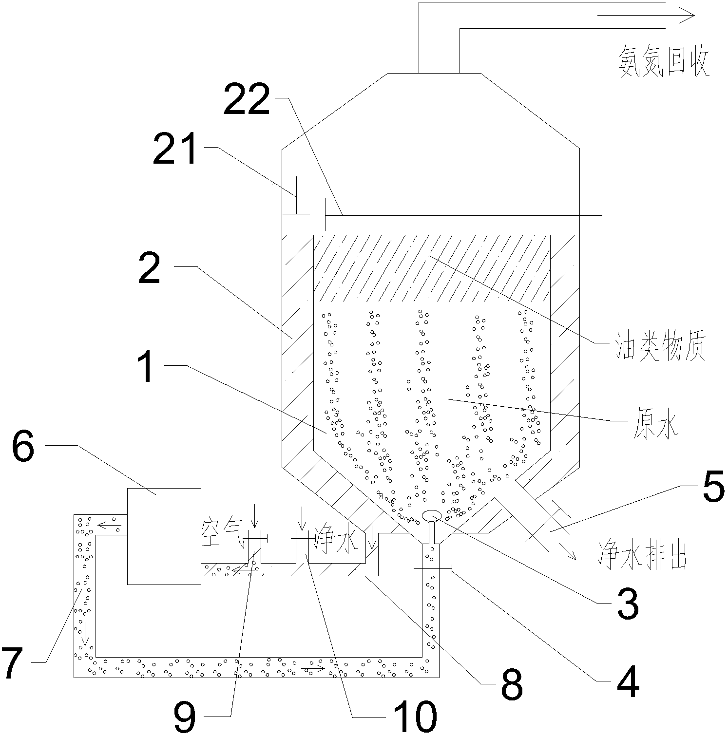 由所述噴頭(3)溢出的氣泡可帶動待處理含油廢水中的油類物質上浮,溢出后經導油槽(2)進入所述循環水管(8);添加了空氣和凈水以后,所述水泵(6)將水和空氣通過所述進水管(7)輸送至所述循環水箱(1)的下端的噴頭(3)進行循環。