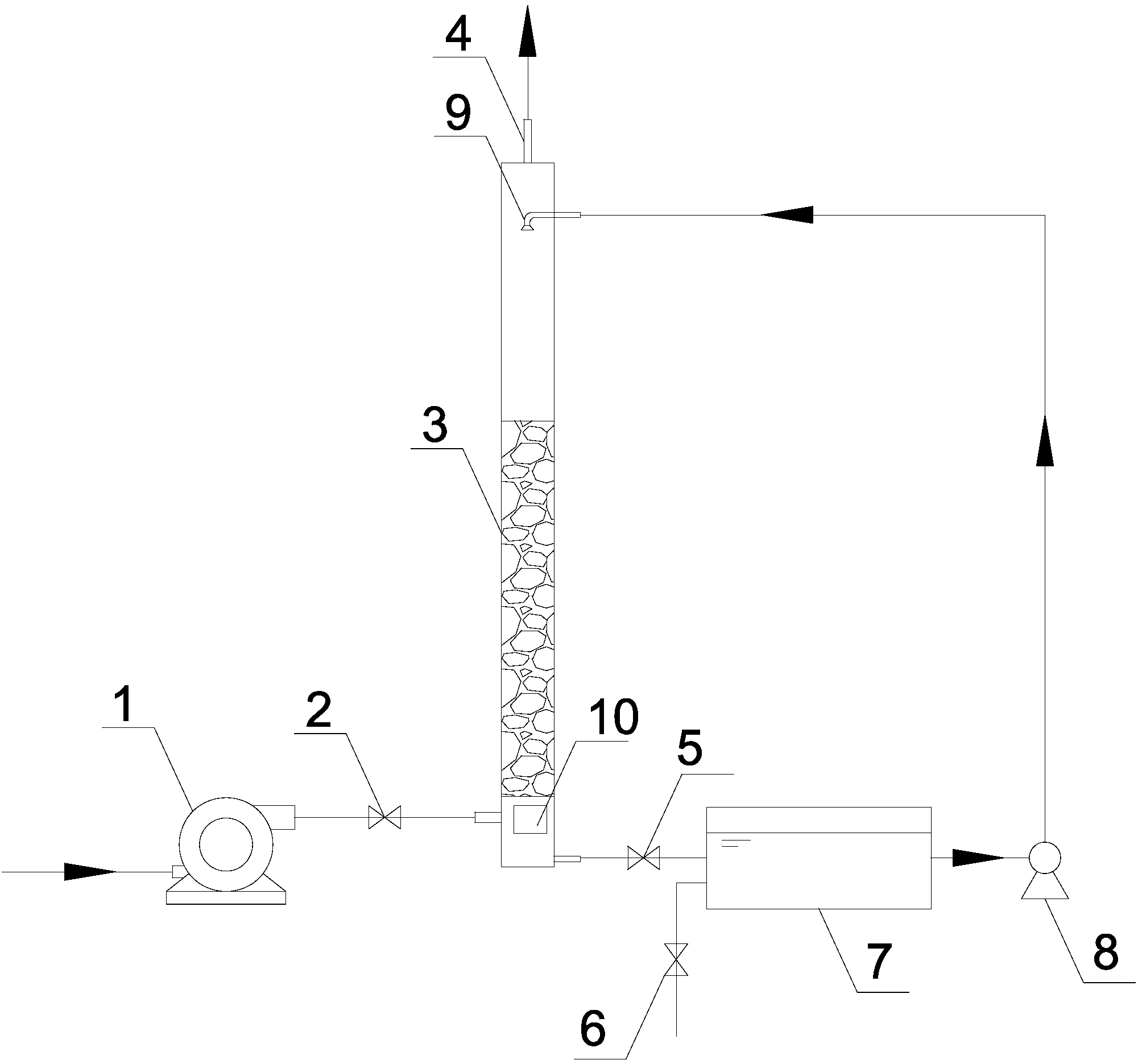 (3)同時處理廢水和廢氣是采用氣水模式:打開進氣閥2,廢氣經風機1以0.5-1m/s的流速進入塔內,經過負載微生物膜的竹炭填料3,被填料上微生物吸附降解,凈化后的氣體由出氣口4達標排放;出水閥5和進水閥6,廢水進入循環水槽7,由循環泵8抽至噴淋系統9噴淋而下,由重力作用自上而下經過竹炭填料3,被微生物吸附降解后,再排入循環水槽7進行循環處理。