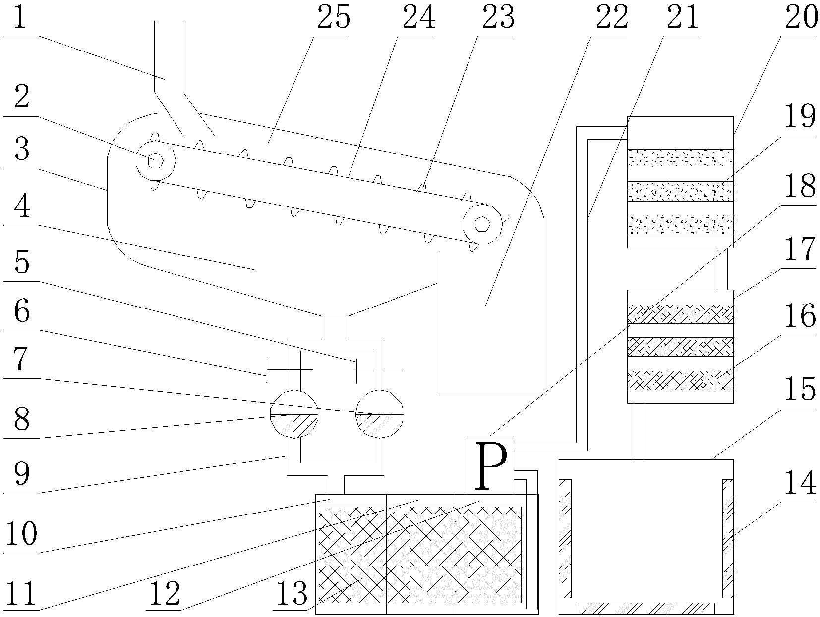 1.一種生活廢水多重凈化處理設備,其特征在于:包括廢水預處理倉(3),廢水預處理倉(3)上設有進水口(1),廢水預處理倉(3)內部具有除雜室(25)、收雜室(22)和接水槽(4),除雜室(25)內設有兩輥筒(2),兩輥筒(2)上設有傳送帶(24),傳送帶(24)的兩側設有擋水板(26),傳送帶(24)上還均布有多個除雜凸起(23),相鄰的兩個除雜凸起(23)之間均布有無數個濾孔(27),接水槽(4)通過水路管道(21)依次連接厭氧池(10)、缺氧池(11)、好氧池(12)、沙礫過濾倉(20)、活性炭吸附倉(17)和消毒池(15),接水槽(4)和厭氧池(10)之間的水路管道(21)上設有兩支路水管(9),兩支路水管(9)上分別設有第一控制閥(5)、第一過濾器(7)和第二控制閥(6)、第二過濾器(8),厭氧池(10)、缺氧池(11)和好氧池(12)內均設有生物填料層(13),好氧池(12)和沙礫過濾倉(20)之間的水路管道(21)上設有抽水泵(18),沙礫過濾倉(20)內設有多個沙礫層(19),活性炭吸附倉(17)內設有多個活性炭吸附層(16),消毒池(15)內設有多組紫外線消毒燈(14)。