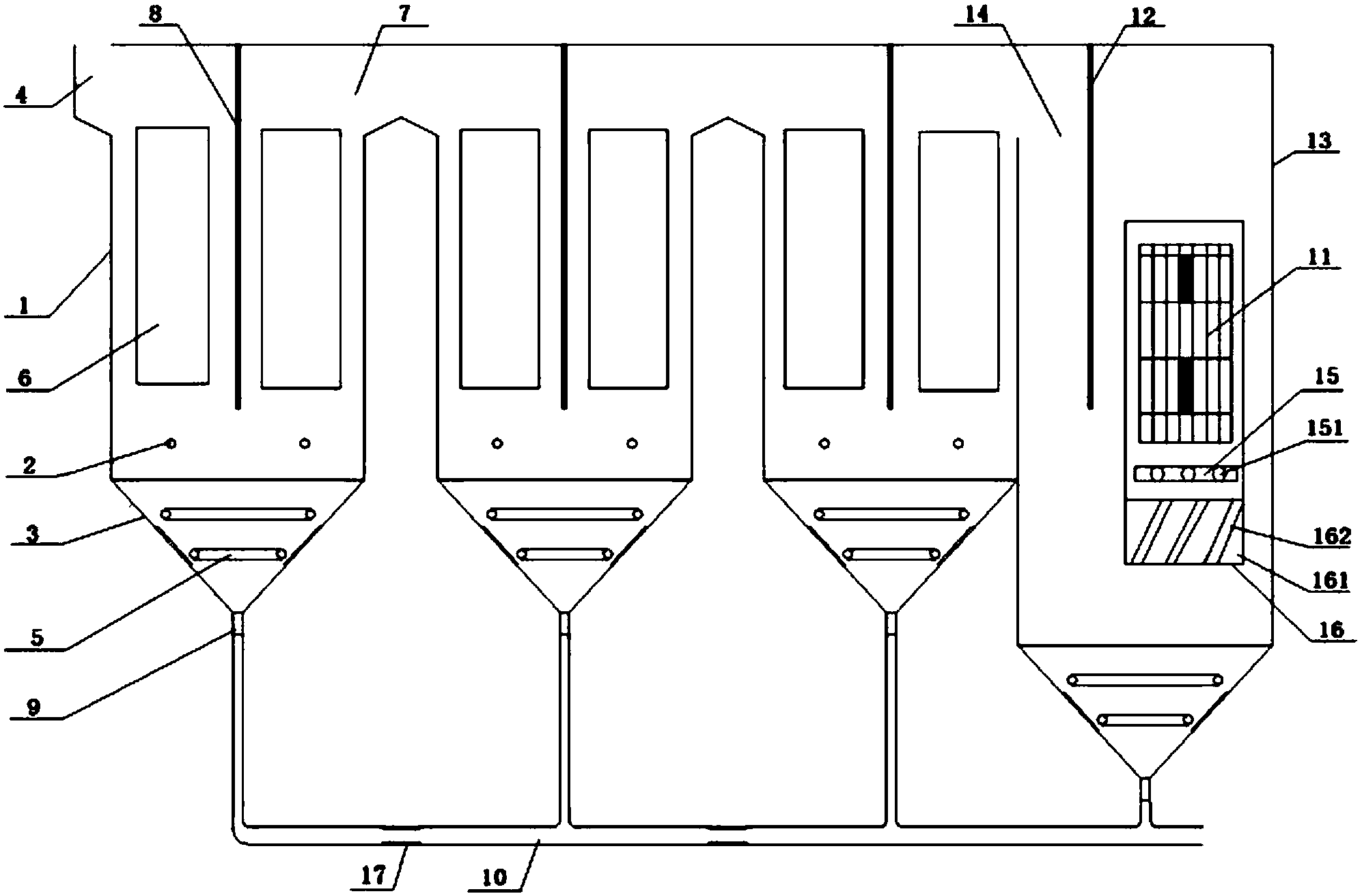 8)經過斜板反應段(16)的污水向上流動并與安裝在斜板反應段(16)上方的交錯流曝氣單元(15)接觸,通過交錯流曝氣單元(15)中的曝氣管(151)對污水進行剪切;