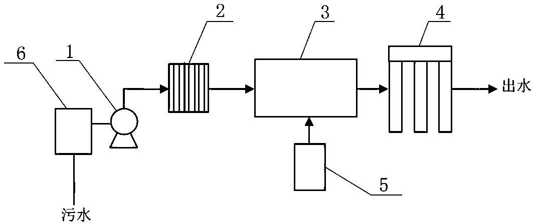 本實用新型主要針對煤層氣開采過程產生的少量廢水使用。煤層氣廢水通過自吸裝置吸入,通過粗過濾裝置對廢水中的較大雜質進行過濾并收集,然后廢水進入氧化裝置與強氧化劑進行接觸氧化,廢水從氧化裝置中流出后進入吸附過濾裝置中,吸附過濾裝置中的吸附過濾材料將廢水中有毒有害物質、重金屬及鹽類進行吸附后達標排放。