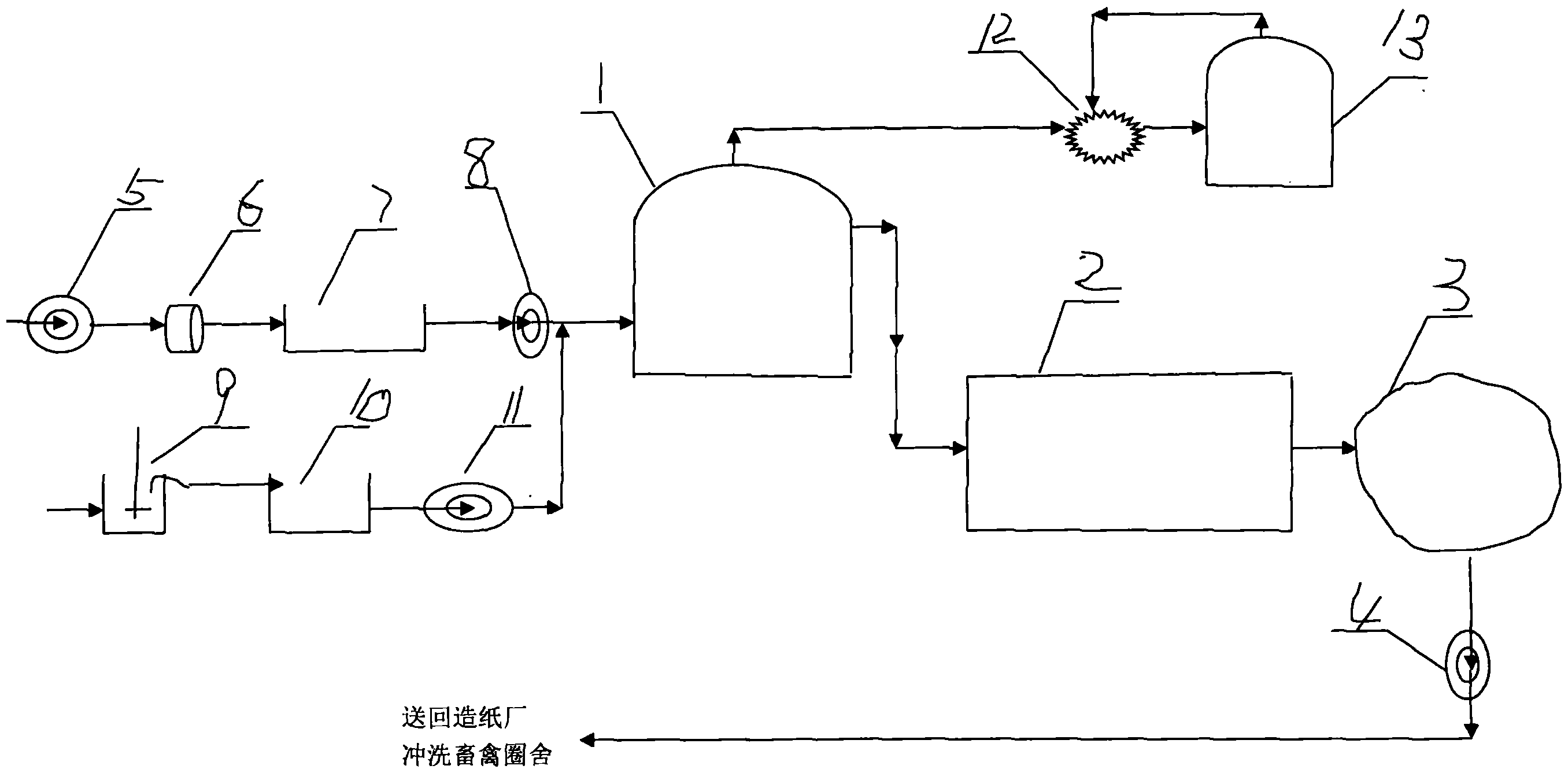 1.造紙廢水處理和養殖業糞便水處理結合的設施,由厭氧好氧集成裝置(1)和濕地(2)組成,其特征在于,造紙廢水和養殖業糞便水經厭氧好氧集成裝置(1)處理,生成生態水,生態水通過管道流到濕地(2),從濕地流到儲存池(3),用水泵(4)把儲存池里的水抽出來,一是沖洗圈舍;二是送回紙廠,循環利用零排放。