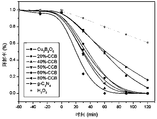 (2)本發明將兩種具有相互匹配的能帶位置關系的材料(Cu3B2O6和g-C3N4)結合,經過研磨-煅燒反應后制備出性能優良的異質結可見光催化劑,這種異質結光催化劑的制備并非兩種材料的簡單復合,而是通過大量的實驗證實Cu3B2O6和g-C3N4之間摻雜形成的異質結結構,不僅增強了對可見光的吸收,而且使光生電子與空穴能夠及時的分離,提高了催化劑的量子效率,從而顯著提高可見光催化效率;