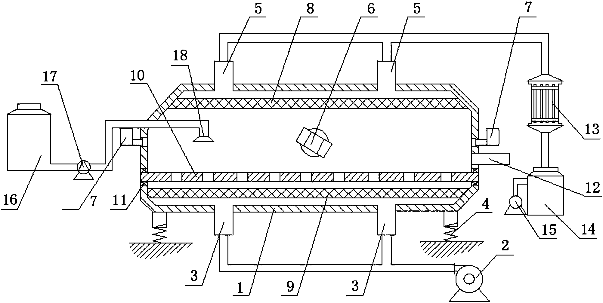 1.一種微波振動流化床重金屬廢水處理回收設(shè)備,包括原料罐(16),原料罐(16)通過抽水泵(17)與流化床床體(1)相聯(lián),流化床床體(1)下端開設(shè)有氣流入口(3),氣流入口(3)通過管道聯(lián)接有鼓風(fēng)機(2),流化床床體(1)上端開設(shè)有氣流出口(5),其特征在于:所述流化床床體(1)通過彈簧(4)聯(lián)接在地面上,流化床床體(1)內(nèi)上部設(shè)有上除沫器(8),上除沫器(8)下方設(shè)有振動篩板(10),振動篩板(10)通過彈簧片(11)安裝在流化床床體(1)內(nèi),流化床床體(1)內(nèi)還設(shè)有振動電機(6),流化床床體(1)上設(shè)有出料口(12)和微波發(fā)生器(7),原料罐(16)與流化床床體(1)聯(lián)接管道的末端設(shè)有高壓噴頭(18)。