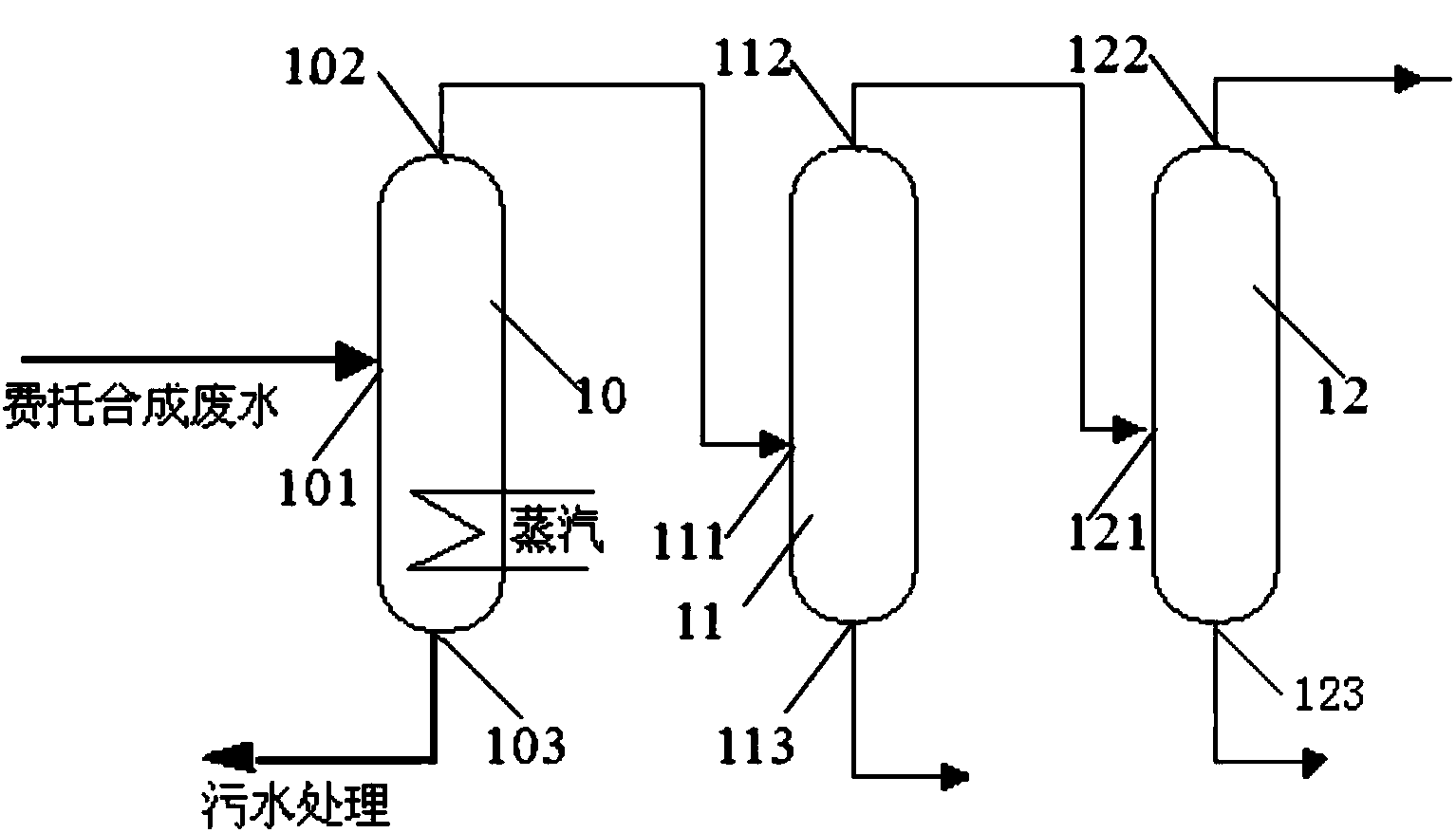 為了實現上述目的,本發(fā)明一個方面提供了一種費托合成廢水處理系統(tǒng),系統(tǒng)包括:脫酸塔,設置有費托合成廢水入口,且脫酸塔的塔頂設置有脫酸氣出口,塔底設置有蒸余液出口;第一堿洗裝置,設置有脫酸氣入口,脫酸氣入口與脫酸塔上的脫酸氣出口相連通;且第一堿洗裝置的頂部設置有第一氣體出口,底部設置有第一乙酸鈉溶液出口;第二堿洗裝置,設置有第一氣體入口,第一氣體入口與第一氣體出口相連通;且第二堿洗裝置的頂部設置有第二氣體出口,底部設置有第二乙酸鈉溶液出口。