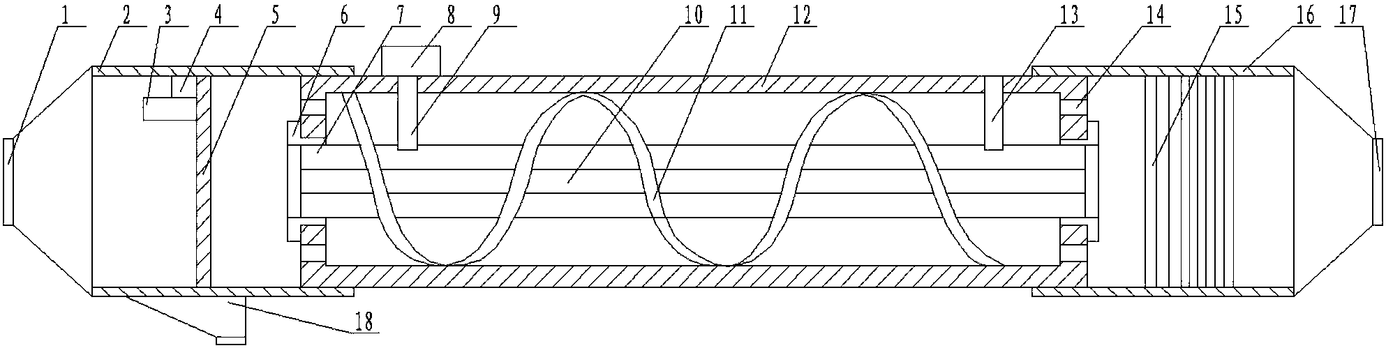 1.一種光催化處理有機(jī)廢水的裝置,包括光催化反應(yīng)箱(12),光催化反應(yīng)箱(12)內(nèi)部中間處通過唇形密封環(huán)(6)安裝有石英玻璃管(7),石英玻璃管(7)內(nèi)設(shè)置有紫外線燈(10),其特征在于光催化反應(yīng)箱(12)左右兩端分別螺紋連接有除雜室(2)和最終過濾室(16),光催化反應(yīng)箱(12)內(nèi)壁沿軸向設(shè)有螺旋狀導(dǎo)流片(11),螺旋狀導(dǎo)流片(11)表面均勻涂有納米二氧化鈦層,所述螺旋狀導(dǎo)流片(11)的外緣與光催化反應(yīng)箱(12)固定連接,光催化反應(yīng)箱(12)左右兩端設(shè)置有連通除雜室(2)和最終過濾室(16)的通孔(14),所述除雜室(2)內(nèi)安裝有若干層濾布(5),每層濾布(5)前端均通過電動伸縮桿(4)安裝有清潔刷(3),清潔刷(3)緊貼于濾布(5)表面設(shè)置,除雜室(2)下端活動安裝有與除雜室(2)相連通的集塵斗(18),除雜室(2)左端設(shè)置有進(jìn)水口(1),最終過濾室(16)內(nèi)設(shè)置有若干塊等間距分布的活性碳板(15),最終過濾室(16)右端設(shè)置有出水口(17)。