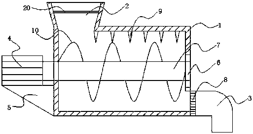 1.一種帶式干燥機污泥自動擠出裝置,包括污泥擠出裝置殼體(1),其特征在于:所述污泥擠出裝置殼體(1)上壁的左端設有進料管口(2),所述進料管口(2)內設有過濾篩(20),所述污泥擠出裝置殼體(1)右壁的下端設有出料管口(3),所述出料管口(3)與污泥擠出裝置殼體(1)交接處設有擠壓篩板(8),所述污泥擠出裝置殼體(1)左壁的下端設有支架(5),所述支架(5)的上端固定有電機(4),所述電機(4)的輸出端貫穿污泥擠出裝置殼體(1)的左壁與轉軸(7)的一端固定連接,所述轉軸(7)的另一端與污泥擠出裝置殼體(1)右壁設有的軸承(6)活動連接,所述轉軸(7)的周向設有螺旋刀片(10),所述污泥擠出裝置殼體(1)內腔的上端設有豎直刀片(9)。