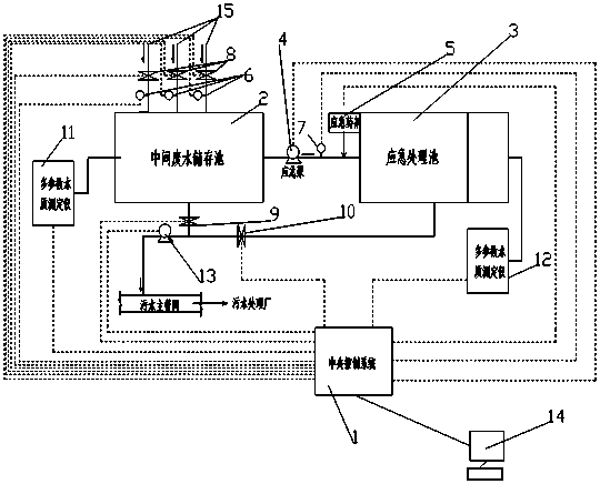 系統(tǒng)還包括應(yīng)急處理系統(tǒng),應(yīng)急處理系統(tǒng)包括應(yīng)急處理池,應(yīng)急處理池與中間廢水儲存池通過設(shè)置有應(yīng)急泵的輸送管路相連,應(yīng)急泵與中央控制系統(tǒng)相連。