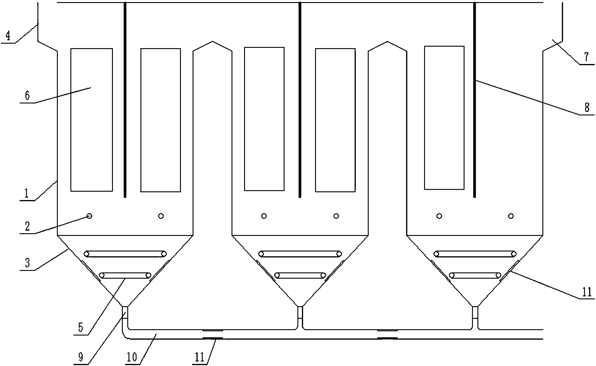 6.根據(jù)權(quán)利要求1所述的污泥回流裝置,其特征在于,每一污水處理單元的回流管(9)均與回流總管(10)相連,回流管(9)和回流總管(10)內(nèi)壁均設(shè)有振動片(11)。