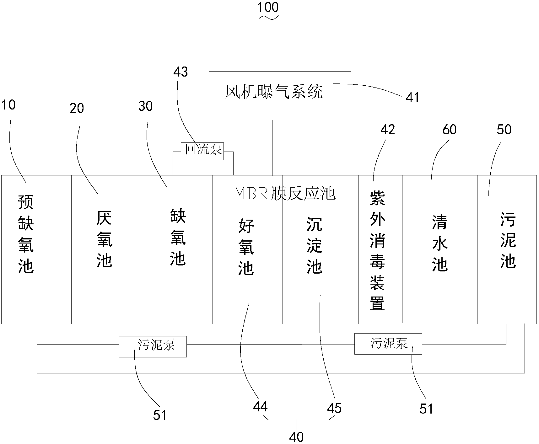 MBR膜反應(yīng)池,所述MBR膜反應(yīng)池的進(jìn)水口與所述缺氧池的出水口連通,所述MBR膜反應(yīng)池與一風(fēng)機(jī)曝氣系統(tǒng)連接,所述MBR膜反應(yīng)池還通過回流泵與所述缺氧池連通,所述MBR膜反應(yīng)池的污泥口分別與預(yù)缺氧池以及一污泥池通過污泥泵連通,所述MBR膜反應(yīng)池的出水口與一紫外消毒裝置的入水口連通;所述污泥池的上部與所述預(yù)缺氧池連通;