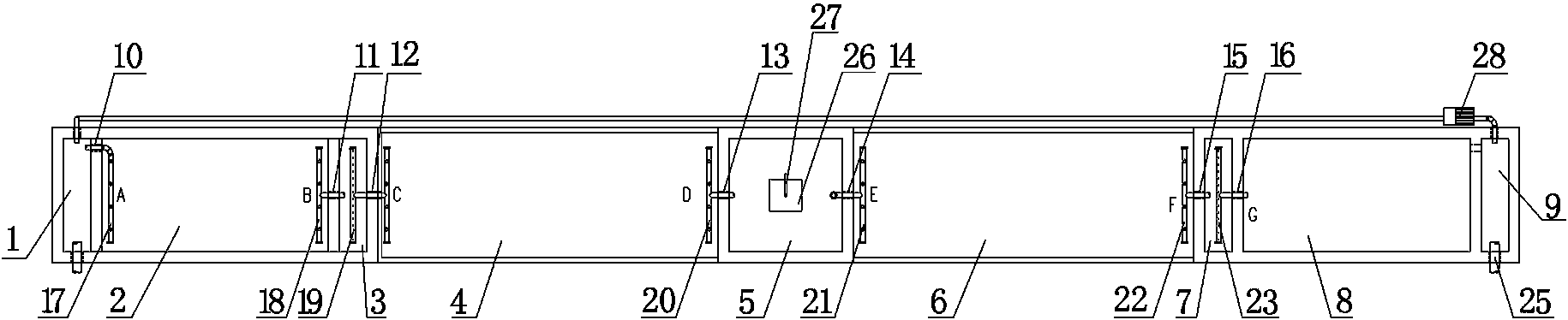 1.一種生活污水處理總站污水管線的安裝結(jié)構(gòu),其特征在于:它包括從左往右順次設(shè)置的格柵渠(1)、酸化調(diào)節(jié)池(2)、初濾池(3)、厭氧生物濾池(4)、充氧池(5)、好氧生物濾池(6)、終濾池(7)、植物檢測池(8)以及放流渠(9),所述的酸化調(diào)節(jié)池(2)內(nèi)添加有厭氧發(fā)酵菌,厭氧生物濾池(4)內(nèi)填裝有厭氧生物載體,好氧生物濾池(6)內(nèi)填裝有好氧生物載體,酸化調(diào)節(jié)池(2)的左墻體上設(shè)置有連通格柵渠(1)的通孔A(10),酸化調(diào)節(jié)池(2)的右墻體上設(shè)置有連通初濾池(3)的通孔B(11),初濾池(3)的右墻體上設(shè)置有連通厭氧生物濾池(4)的通孔C(12),充氧池(5)的左墻體上設(shè)置有連通厭氧生物濾池(4)的通孔D(13),充氧池(5)的右墻體上設(shè)置有連通好氧生物濾池(6)的通孔E(14),終濾池(7)的左墻體上設(shè)置有連通好氧生物濾池(6)的通孔F(15),終濾池(7)的右墻體上設(shè)置有連通植物檢測池(8)的通孔G(16),該生活污水處理總站污水管線的安裝結(jié)構(gòu)還包括排污管A(17)、排污管B(18)、排污管C(19)、排污管D(20)、排污管E(21)、排污管F(22)以及排污管G(23),所述的排污管A(17)呈L形狀,排污管A(17)的長管設(shè)置于酸化調(diào)節(jié)池(2)內(nèi)且垂直于酸化調(diào)節(jié)池(2)的前墻體設(shè)置,排污管A(17)的短管插裝于通孔A(10)內(nèi),所述的排污管B(18)、排污管D(20)、排污管E(21)、排污管F(22)和排污管G(23)均呈T形狀,排污管B(18)的長管設(shè)置于酸化調(diào)節(jié)池(2)內(nèi)且平行于排污管A(17)的長管設(shè)置,排污管B(18)的短管插裝于通孔B(11)內(nèi),排污管D(20)的長管設(shè)置于厭氧生物濾池(4)內(nèi)且平行于排污管A(17)的長管設(shè)置,排污管D(20)的短管插裝于通孔D(13)內(nèi),排污管E(21)的長管設(shè)置于好氧生物濾池(6)內(nèi)且平行于排污管A(17)的長管設(shè)置,排污管E(21)的短管插裝于通孔E(14)內(nèi),排污管F(22)的長管設(shè)置于好氧生物濾池(6)內(nèi)且平行于排污管A(17)的長管設(shè)置,排污管F(22)的短管插裝于通孔F(15)內(nèi),排污管G(23)的長管設(shè)置于終濾池(7)內(nèi)且平行于排污管A(17)的長管設(shè)置,排污管G(23)的短管插裝于通孔G(16)內(nèi),所述的排污管C(19)呈H形狀,排污管C(19)的兩根長管分別設(shè)置于初濾池(3)和厭氧生物濾池(4)內(nèi),排污管C(19)的短管插裝于通孔C(12)內(nèi),所述的排污管A(17)、排污管B(18)、排污管C(19)、排污管D(20)、排污管E(21)、排污管F(22)以及排污管G(23)的長管兩端均設(shè)置有封頭(24)且長管上且沿長管的長度方向上設(shè)置有多個小孔,所述的放流渠(9)上設(shè)置有污水排放管(25)。