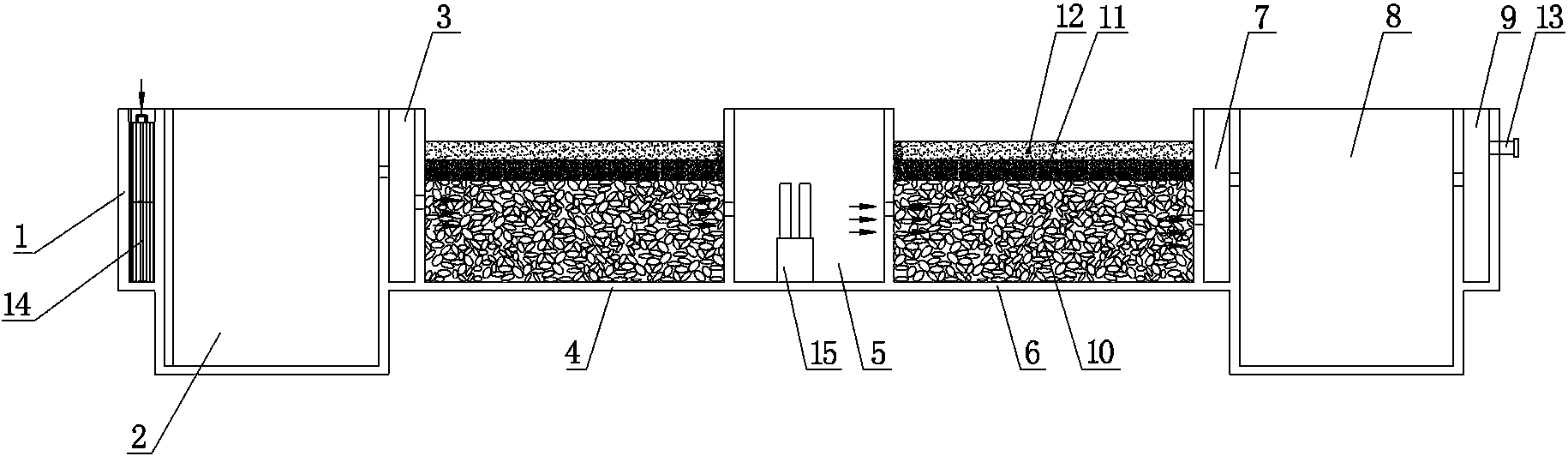 1.一種具有生物載體填料結構的生物污水處理總站,其特征在于:它包括從左往右順次連通的格柵渠(1)、酸化調節池(2)、初濾池(3)、厭氧生物濾池(4)、充氧池(5)、好氧生物濾池(6)、終濾池(7)、植物檢測池(8)以及放流渠(9),所述的酸化調節池(2)內添加有厭氧發酵菌,厭氧生物濾池(4)和好氧生物濾池(6)內均設置于生物載體填料結構,填料結構由從下往上順次設置的卵石層(10)、米石層(11)和細沙層(12)組成,厭氧生物濾池(4)中米石層(11)和細沙層(12)內均添加有厭氧生物載體,好氧生物濾池(6)中米石層(11)和細沙層(12)內均添加有好氧生物載體,放流渠(9)的側壁上設置有污水排出管(13),所述的格柵渠(1)內設置有扁鋼柵條(14),所述的充氧池(5)內安裝有曝氣裝置(15)。