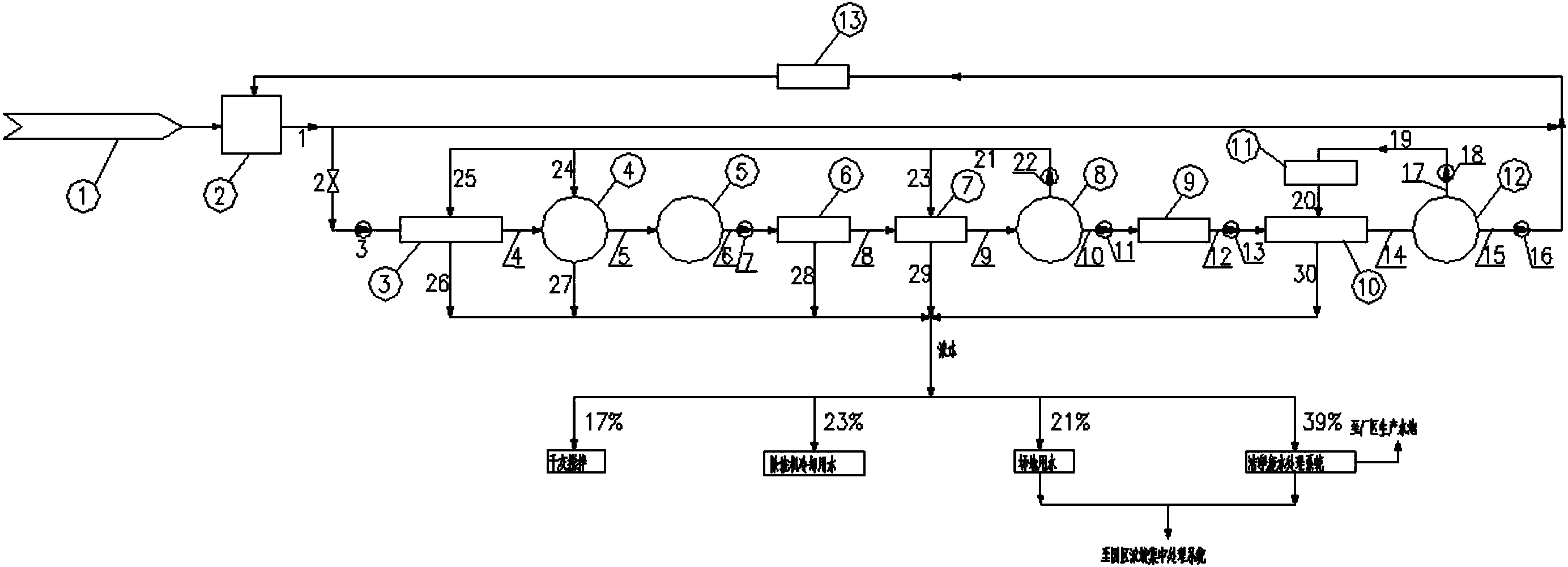 1.一種垃圾焚燒電廠冷卻水處理系統(tǒng),包括多介質(zhì)過濾器、軟化裝置、凈水箱、碟片過濾器、超濾裝置、超濾水箱、保安濾器、反滲透裝置、反滲透水箱、清洗濾器,其特征在于:多介質(zhì)過濾器和冷卻塔水箱通過多介質(zhì)過濾器第一進(jìn)水管道(1)、進(jìn)水閥(2)和輸送泵(3)相連,軟化器和多介質(zhì)過濾器通過軟化器第一進(jìn)水管道(4)相連,凈水箱和軟化器通過凈水箱第一進(jìn)水管道(5)相連,碟片過濾器和凈水箱通過碟片過濾器第一進(jìn)水管道(6)和凈水泵(7)相連,超濾裝置和碟片過濾器通過超濾第一進(jìn)水管道(8)相連,超濾水箱和超濾裝置通過超濾水箱第一進(jìn)水管道(9)相連,保安濾器與超濾水箱通過保安濾器第一進(jìn)水管(10)、UF水泵(11)相連,反滲透裝置和保安濾器通過反滲透第一進(jìn)水管道(12)和高壓泵(13)相連,RO產(chǎn)水箱與RO裝置通過RO水箱第一進(jìn)水管(14)相連,產(chǎn)水經(jīng)由循環(huán)回水母管(15)以及反滲透產(chǎn)水泵(16)送至換熱器進(jìn)行換熱過后,循環(huán)至冷卻塔水箱;所述系統(tǒng)中RO裝置清洗用水由RO水箱通過RO水箱第一出水管(17)、RO清洗水泵(18)、清洗濾器第一進(jìn)水管(19)送至清洗濾器過濾后,經(jīng)由RO第二進(jìn)水管(20)進(jìn)入RO裝置進(jìn)行清洗;所述系統(tǒng)中超濾裝置、軟化器、多介質(zhì)過濾器的清洗用水由超濾水箱通過超濾水箱第一出水管(21)和清洗水輸送泵(22),超濾第二進(jìn)水管(23)、軟化器第二進(jìn)水管(24)、多介質(zhì)過濾器第二進(jìn)水管(25)供至超濾裝置、軟化器和多介質(zhì)過濾器進(jìn)行反清洗;所述系統(tǒng)中各裝置濃水通過多介質(zhì)過濾器排水管(26)、軟化器排水管(27)、碟片過濾器排水管(28)、超濾排水管(29)、反滲透排水管(30)匯集,其中17%用于干灰攪拌,21%用于場地用水,23%用于除渣機(jī)冷卻用水,39%進(jìn)入潔凈廢水處理系統(tǒng),場地沖洗后的排水和潔凈廢水處理系統(tǒng)的濃水匯流至園區(qū)濃液集中處理系統(tǒng)。