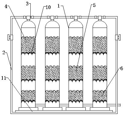 本實用新型的有益效果是:與現有技術相比,本實用新型的優點是,該設備結構簡單,處理效果好,并且采用并列式的結構設置,可以提高鎳廢水的處理效率,而且為了提高鎳廢水的處理效果,在吸附罐的側面還設置PH值調節罐,通過多層吸附功能,達到排放要求,而且本發明為了節省吸附層材料的設置,故在一個吸附罐內設置三層,而為了增大吸附面積,將吸附層的上表面設置為波浪形,這樣吸附面積增大,處理效果增強。