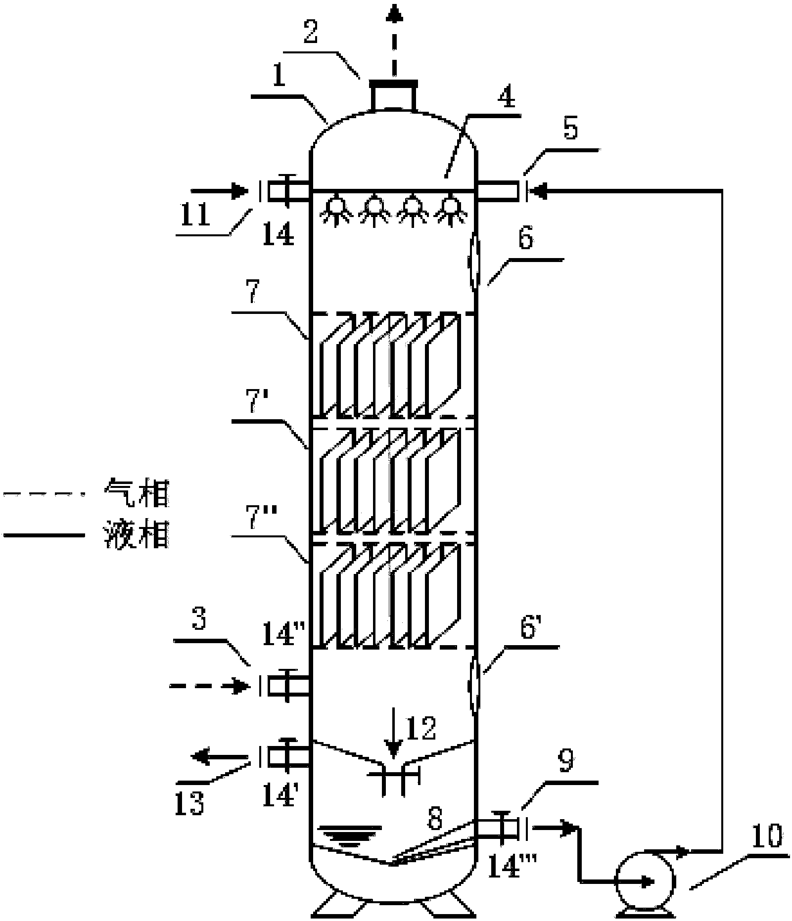 有鑒于現(xiàn)有技術(shù)的上述缺陷,本發(fā)明提供一種集成處理廢氣及污水的生化設(shè)備及其處理方法,填料規(guī)整上下層十字交差排放安裝,液體在下行過程中二次均勻分布的問題,由于新型酶浮填料親水性非常好,填料自身很容易吸附泥水中菌膠團(tuán),有利于污泥的生長,由于規(guī)整填料間隙均勻,氣體、液體阻力無大的差異,待填料生物膜掛到一定厚度,便會自然脫落,達(dá)到一種動態(tài)平衡;同時消除了填料堵塞的問題。