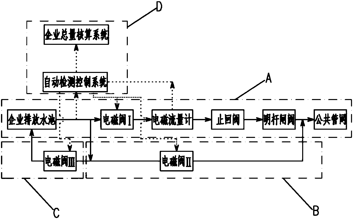 第七步、比較的結果若超過允許排放總量,企業總量核算系統向自動檢查控制系統發出指令,自動檢查控制系統立即關掉電磁閥I,啟動電磁閥III,使得超標廢水回流至企業排放水池;若沒有超過允許排放總量,則不動作。