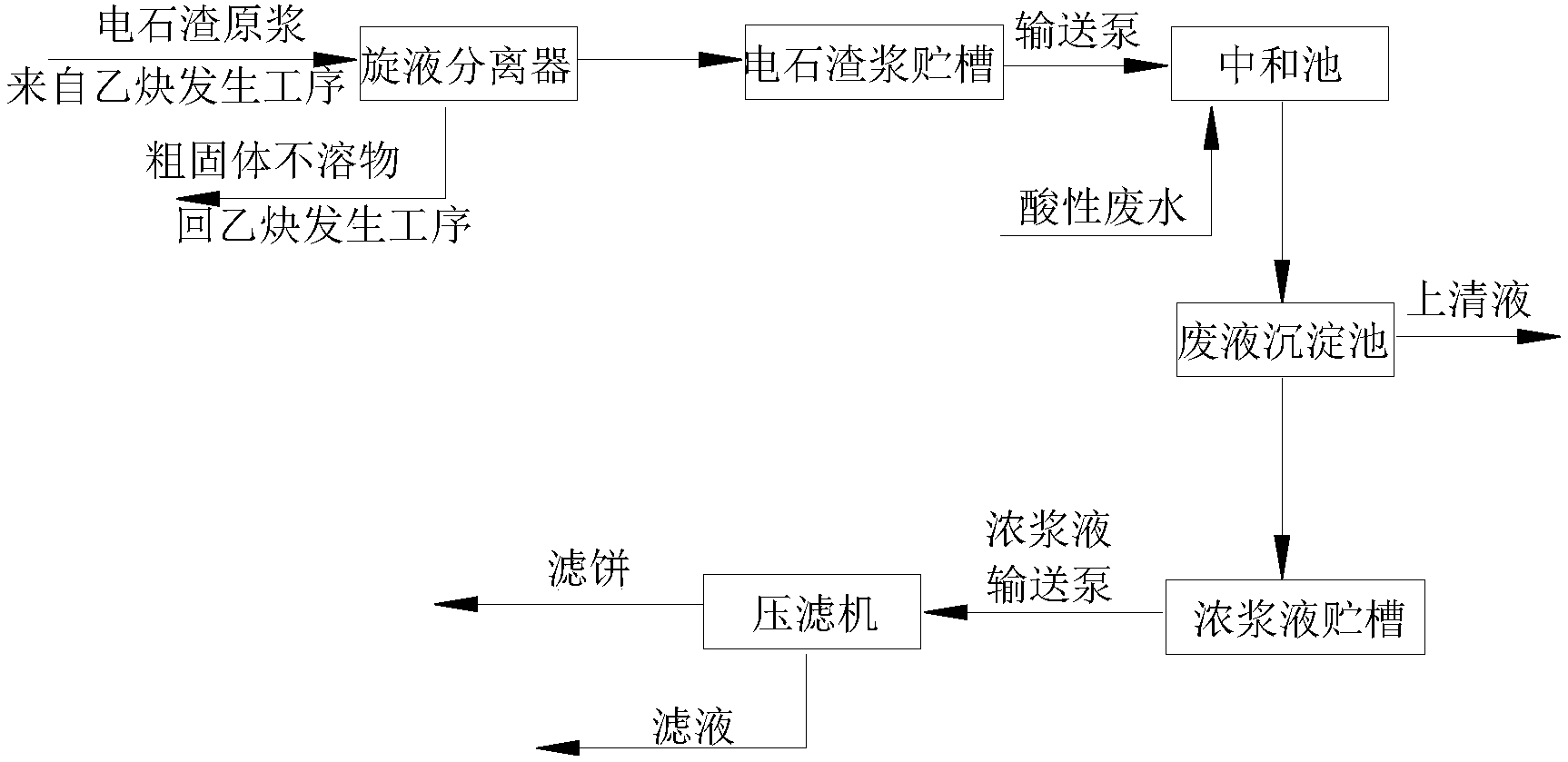 本發明的有益效果是:本發明采用電石渣漿處理氯化法鈦白粉生產過程中的酸性廢水,處理流程短、操作簡單、便于生產運行管理,實現了以廢治廢;節約了在酸性廢水處理過程中石灰粉的采購、堆放、化漿等費用;整個處理過程為液體封閉輸送,現場環境清潔衛生;中和反應后濾餅用作水泥生產的原料,實現了鈦白粉廢渣的綜合利用,經濟環保。同時實現了將鈦白粉行業和電石法聚氯乙烯行業、電石渣制水泥行業的高度關聯。