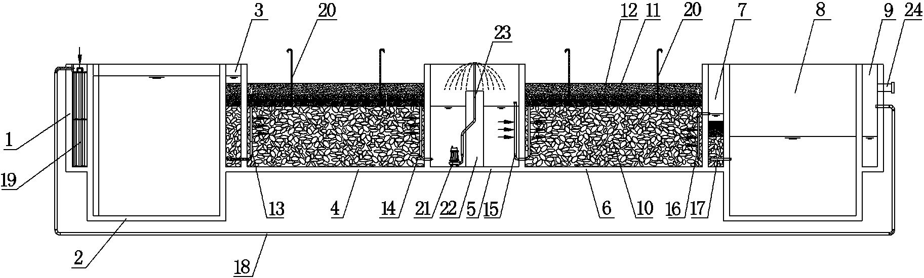 所述的排污管A(13)、排污管B(14)和排污管D(16)均為L形狀,排污管A(13)和排污管B(14)的長管均垂向設(shè)置且設(shè)置于厭氧生物濾池(4)中的卵石層(10)內(nèi),排污管D(16)的長管垂向設(shè)置且設(shè)置于好氧生物濾池(6)中的卵石層(10)內(nèi),所述的排污管C(15)為U形狀,排污管C(15)的一根長管設(shè)置于充氧池(5)內(nèi),排污管C(15)的另一根長管垂向設(shè)置且設(shè)置于好氧生物濾池(6)中的卵石層(10)內(nèi),所述的每根長管上且沿長管的長度方向順次設(shè)置有多個小孔,所述的放流渠(9)與格柵渠(1)之間連接有污水超越管(18),放流渠(9)的側(cè)壁上還設(shè)置有達(dá)標(biāo)水排放口(24),所述的格柵渠(1)與酸化調(diào)節(jié)池(2)連通,格柵渠(1)內(nèi)還設(shè)置有扁鋼柵條(19);