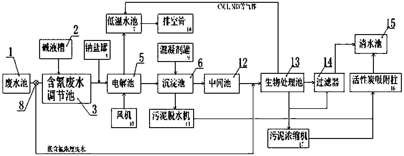 1.含氰廢水多級處理裝置,其特征是,包括依次連接的高濃度處理裝置、低濃度處理裝置,所述高濃度處理裝置包括依次連通的廢水池(1)、選擇閥(8)、含氰廢水調節池(3)、電解池(5)、沉淀池(6)、中間池(12),還包括堿液槽(2),所述堿液槽(2)與所述含氰廢水調節池(3)相連通;