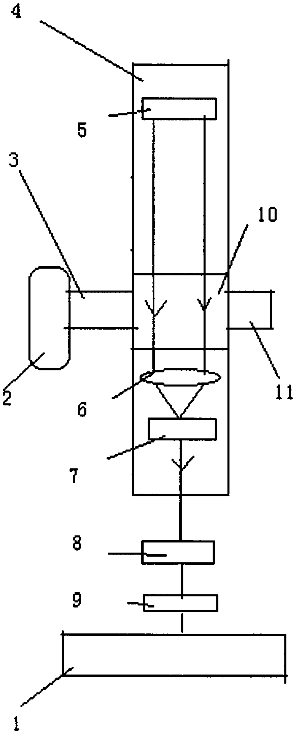 1.污水BOD散射式檢測臺,其特征在于:包括設置在污水池(2)右側的污水管(3),污水管(3)的右側與透明檢測室(10)的進水口相連,透明檢測室(10)右側與出水管(11)固結;所述的透明檢測室(10)安裝在散射式檢測裝置機架(4)的中部,所述的散射式檢測裝置機架(4)內依次從上到下設置有散射式LED單色光源(5)、透明檢測室(10)、透鏡(6)、光電傳感器(7);光電傳感器(7)的輸出信號通過濾波放大器(8)、DSP處理器(9)送到計算機(1)。