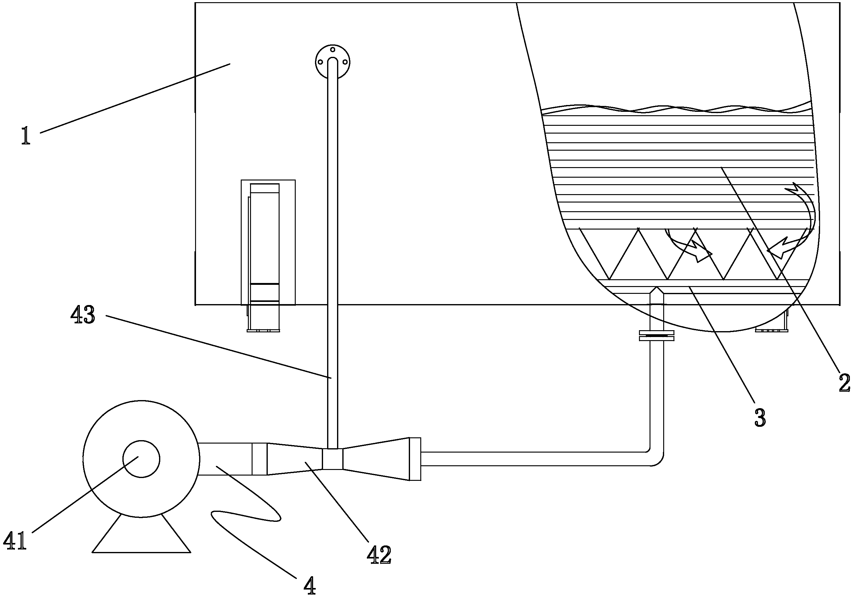 2.根據權利要求1所述的一種應用于高含鹽高結垢率廢水的 翻騰蒸發系統,其特征在于所述的射流裝置(4)包括有射流泵(41), 在所述射流泵(41)上連接有射流器(42),在所述射流器(42)進 氣口上設有進氣管(43),所述進氣管(43)一端與設置在蒸發器(1) 上端的出氣口相連接,所述射流器(42)出口端與所述曝氣裝置(3) 相連接。