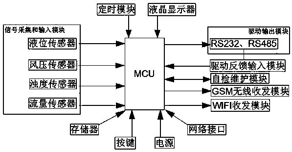 進一步的,所述MCU配置有存儲器接口,并通過存儲器接口連接有用于存儲液位、風壓、濁度和流量數據、驅動反饋輸入模塊反饋的控制信息的存儲器。