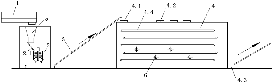 1.一種污泥減量處理系統,其特征在于包括壓濾機、污泥攪拌機、皮帶輸送機以及干燥機,所述壓濾機設置于污泥攪拌機上方,壓濾機出口通過設置集泥斗連接污泥攪拌機上端入泥口,污泥攪拌機底部排泥口正對下方的皮帶輸送機,皮帶輸送機末端位于干燥機進泥口上方,所述污泥攪拌機包括罐體,罐體底端為泥斗,泥斗末端設置有排泥口,罐體中心設置有攪拌軸,攪拌軸上端連接驅動電機,攪拌軸上設置有3層攪拌葉片,攪拌葉片為螺旋槳葉,攪拌軸外圍設置有中心筒,中心筒套于攪拌軸上,將罐體分隔成內外兩個腔室,中心筒上均布有通孔,中心筒內筒壁圍繞圓心設置有若干條豎直的凸條,凸條外端面距離攪拌葉片最外徑100~150mm;所述干燥機包括箱體,進泥口開設于箱體一側頂端,進泥口一側設置有進風口,箱體近底端設置有出泥口,所述箱體內從上往下依次排布有5道相互水平的輸送帶,第2和第4輸送帶的末端均超出第1、3、5輸送帶的末端,在第3、4、5輸送帶之間設置有至少一個破碎裝置,所述破碎裝置包括與輸送帶垂直的轉軸、與轉軸連接的驅動電機、以及轉軸上的破碎葉片,所述破碎葉片為十字型,破碎葉片端部為鋸齒狀。