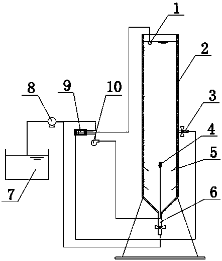 1.一種脫氮好氧顆粒污泥反應(yīng)器,其特征在于包括用于接種好氧顆粒污泥的反應(yīng)器主體(2),反應(yīng)器主體(2)底部設(shè)置進(jìn)水口(6)、頂部設(shè)置液位計(jì)(1),反應(yīng)器主體(2)中部設(shè)置出水口(3),反應(yīng)器主體(2)腔體內(nèi)設(shè)置曝氣裝置(4),曝氣裝置(4)設(shè)置在反應(yīng)器主體(2)總高度1/3-1/4位置,反應(yīng)器主體(2)底部與曝氣裝置(4)之間每隔反應(yīng)器主體(2)總高度1/8-1/10位置設(shè)置一個(gè)環(huán)狀導(dǎo)流槽(5),環(huán)狀導(dǎo)流槽(5)固定在反應(yīng)器主體(2)內(nèi)壁上,所述的環(huán)狀導(dǎo)流槽(5)向反應(yīng)器主體(2)腔體內(nèi)傾斜設(shè)置,環(huán)狀導(dǎo)流槽(5)與水平面的夾角為40-50度,環(huán)狀導(dǎo)流槽(5)的寬度為反應(yīng)器主體(2)內(nèi)徑的1/9-1/11;曝氣裝置(4)通過進(jìn)氣管與鼓風(fēng)機(jī)(10)連接,進(jìn)水口(6)通過進(jìn)水管與進(jìn)水泵(8)連接,進(jìn)水泵(8)與污水配水池(7)連接;還包括控制器(9),控制器(9)與進(jìn)水泵(8)、鼓風(fēng)機(jī)(10)、液位計(jì)(1)控制連接。