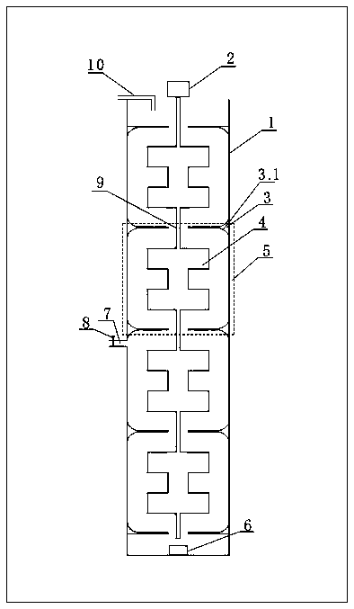A、所述的可控流場反應器(1)為圓柱體,底部設有曝氣裝置(6),頂部連接進水口(10),中間位置與出水閥(8)控制的出水口(7)連通;