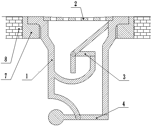1.污水排放隔絕裝置,其特征在于:包括本體(1)、過濾蓋(2)、水封件(3)和重力蓋板(4),本體(1)上端活動安裝有過濾蓋(2),本體(1)內的中部安裝有水封件(3),本體(1)下端的出口安裝有重力蓋板(4),所述重力蓋板(4)為一端設配重塊的密封板且所述密封板與出水口相配合;