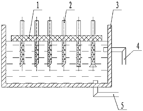 為了實現上述目的,本實用新型采用以下技術方案:它包括廢水處理池;廢水處理池中有漂浮板,該漂浮板上固定有若干向下伸入廢水處理池中的加料管,各加料管位于漂浮板以下的部位分布有若干小孔。
