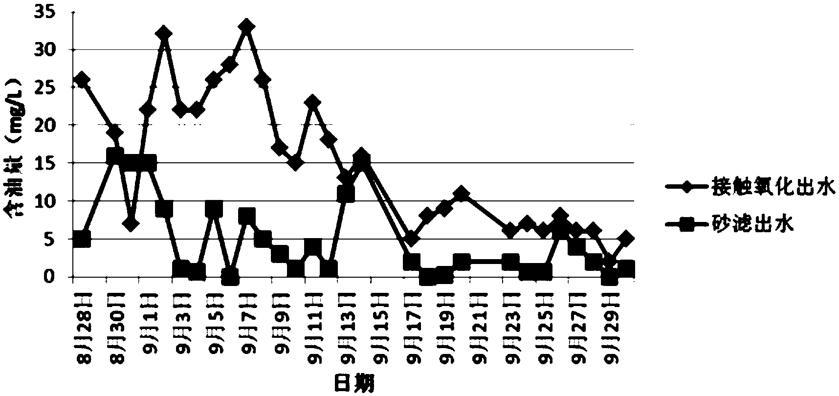本發(fā)明提供的三元復合驅(qū)采出水處理方法,針對三元復合驅(qū)采 出水乳化程度高,首先通過曝氣進行破乳;接著在氣浮中通過微氣 泡去除大部分油;然后進行活性污泥處理,使其中的懸浮物質(zhì)以及 剩余的油被活性污泥分解吸收,大分子變成小分子,再通過粗濾去 除大量菌膠團、懸浮微生物、無機懸浮物等,最后通過砂濾系統(tǒng), 砂濾出水達到回注水標準。本發(fā)明將物理方法與生物方法相結合, 處理三元復合驅(qū)采出水效果顯著。