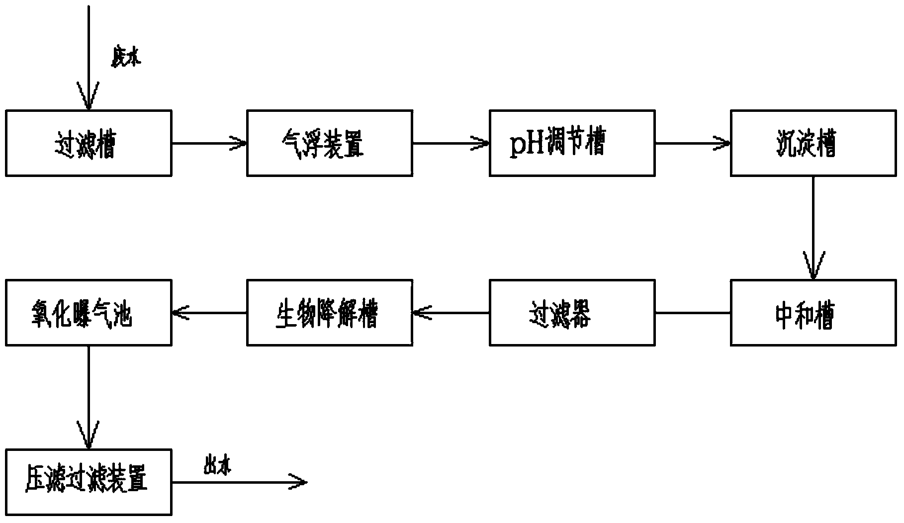 一種工業(yè)廢水的微生物降解水處理系統(tǒng),沿著廢水的流向,包括依次串 聯(lián)的過濾槽、氣浮裝置、pH調(diào)節(jié)槽、沉淀槽、中和槽、搭載有離子交換樹 脂的過濾器、生物降解槽、曝氣池及壓濾過濾裝置。