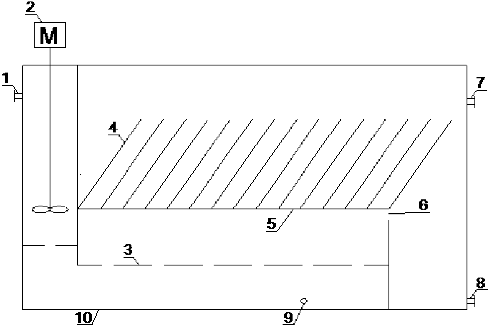 本裝置所述箱體從進(jìn)水口到出水口依次設(shè)有攪拌區(qū)、沉降區(qū)和污泥室,所述箱體的進(jìn)水口設(shè)置在攪拌區(qū)的上方,攪拌區(qū)內(nèi)設(shè)有攪拌裝置的攪拌部件,所述沉降區(qū)通過水平設(shè)置的多孔隔板和支撐板分隔為上區(qū)、中區(qū)和下區(qū),所述上區(qū)、中區(qū)和下區(qū)垂直排列,所述上區(qū)內(nèi)排列有斜板或斜管作為沉降加速裝置,所述斜板或斜管固定在支撐板上方,所述攪拌區(qū)的出口與沉降區(qū)的下區(qū)入口連接,所述沉降區(qū)的中區(qū)通過溢流口與污泥室連通,所述沉降區(qū)的上區(qū)與污泥室連通,所述箱體在污泥室的上方的側(cè)壁上設(shè)有箱體的出水口,所述箱體在污泥室的底部的側(cè)壁上設(shè)有污泥室排泥口。本實用新型結(jié)構(gòu)緊湊,提高水中懸浮物的沉降性能、降低出水中懸浮物。