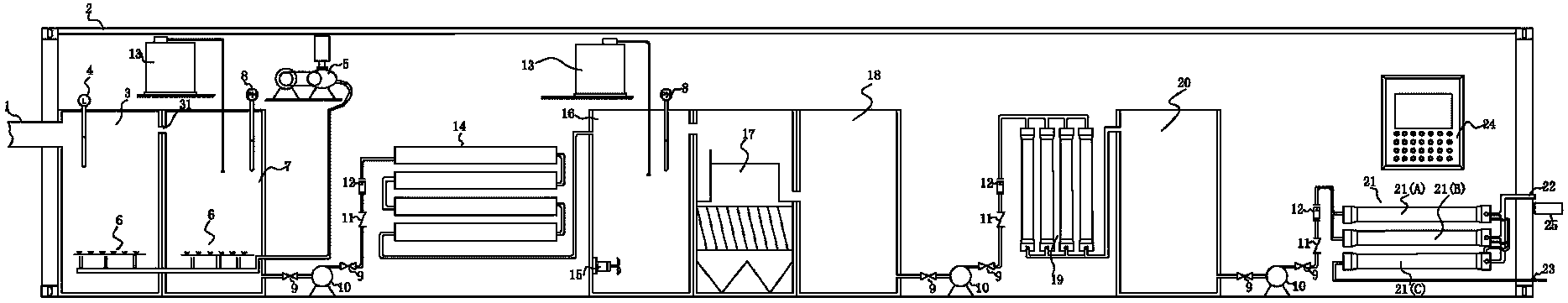 本實用新型的解決的技術問題是針對上述現有技術中的存在的缺陷,提供一種集裝箱式移動應急垃圾滲濾液處理裝置,該裝置智能化程度高、操作方便、處理后水質好,能在滲濾液處理站在遇到緊急情況時應急使用,且移動方便,處理效率高。