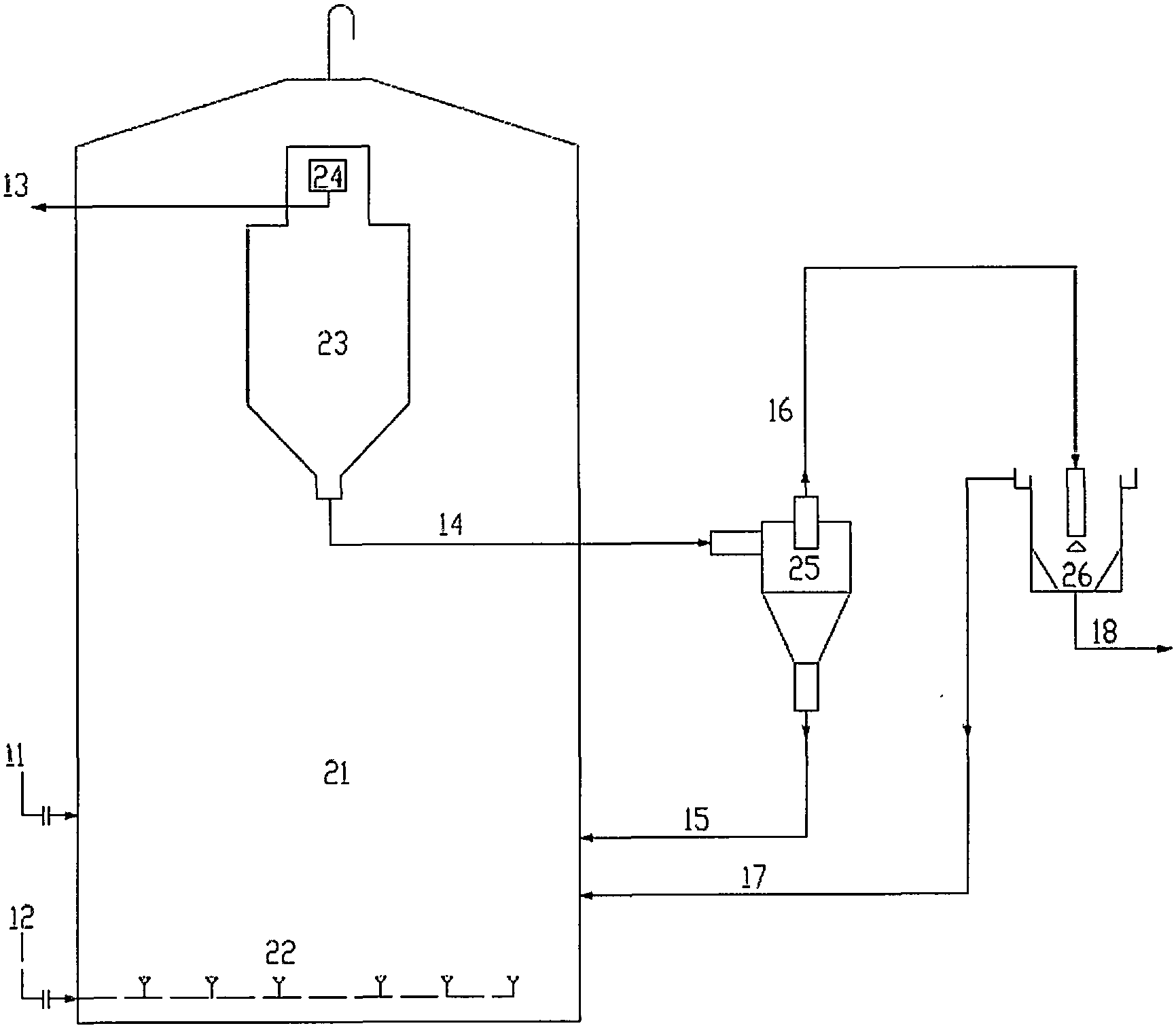 步驟6)沉淀池出水進入厭氧氨氧化反應器(5),以去除廢水中的氨氮,該工藝段由三部分組成:厭氧氨氧化反應器(21)、旋流器(25)和污泥濃縮池(26);
